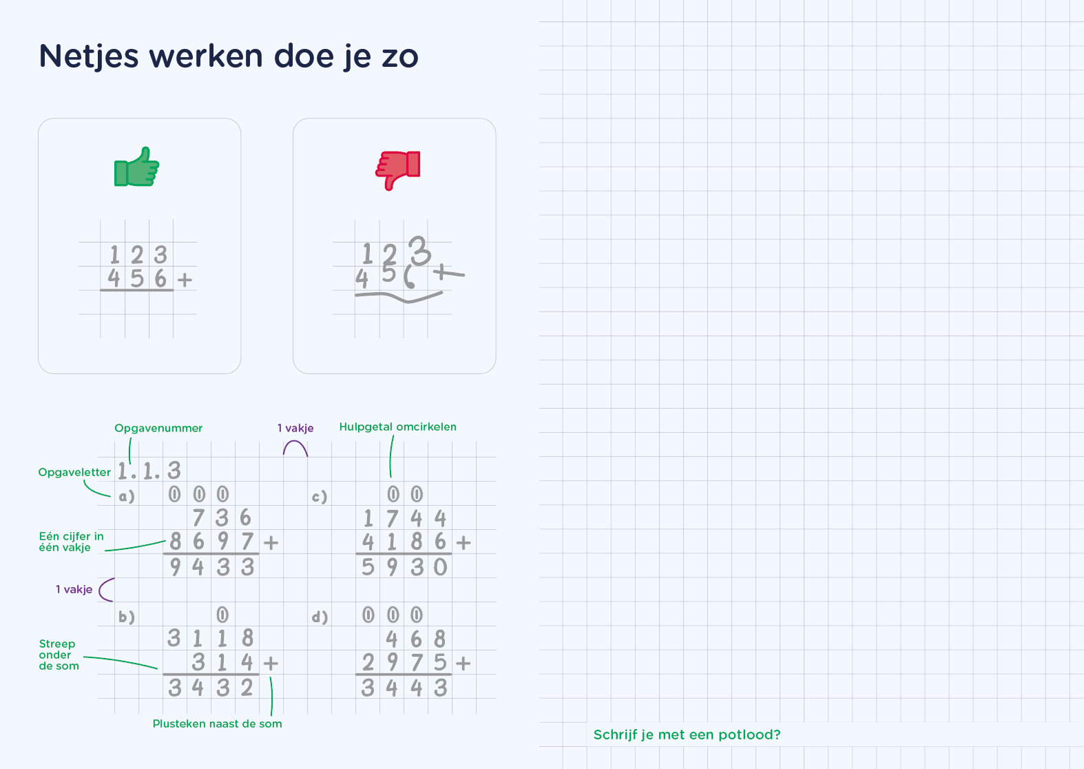 Maar naast deze resultaten is er ook een belangrijke voorwaarde: netjes schrijven. Netjes schrijven voorkomt fouten en maakt rekenen makkelijker. Het NMI heeft daarom een nieuw rekenschrift ontwikkeld.