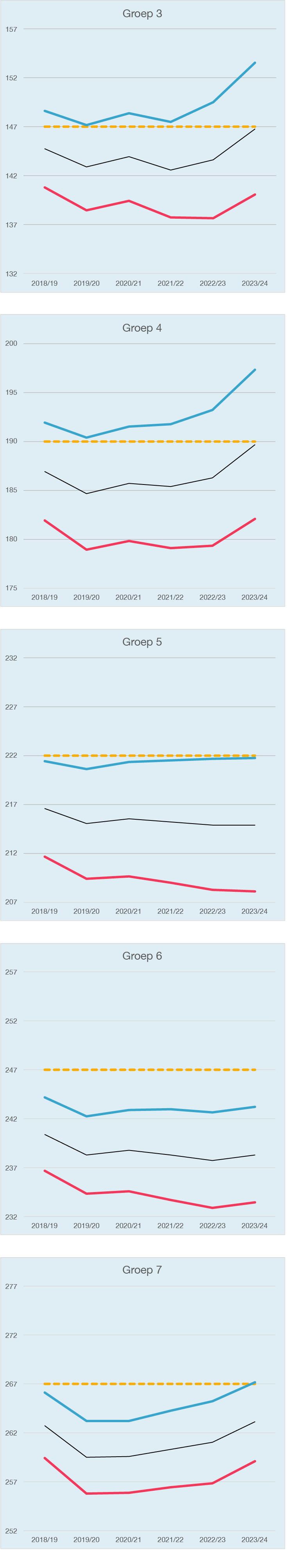 In de grafieken is per groep de rekenkloof in de afgelopen zes jaren in beeld gebracht. Zwart: totaalgemiddelde per groep. Blauw: gemiddelde vaardigheidsscore van jongens. Rood: gemiddelde vaardigheidsscore van meisjes. Oranje: indicatieve 1S-route (theoretische normlijn richting 1S eind basisschool). Let op: in groep 3, 4 en 5 is deze oranje stippellijn uitsluitend bedoeld ter oriëntatie; in de praktijk wordt 1S vanaf groep 6 expliciet gebruikt. De normlijn is in elke grafiek op dezelfde relatieve positie geplaatst om patronen tussen groepen visueel te kunnen vergelijken.