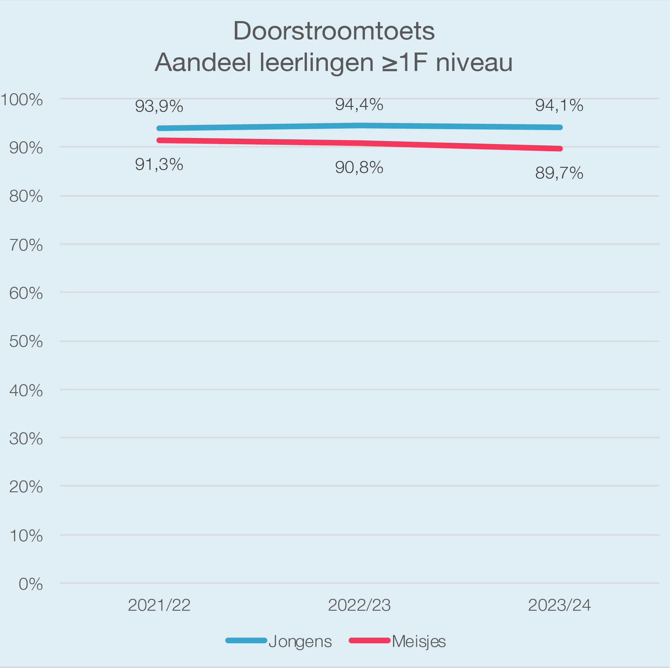 De NCO-data bestaan zoals gezegd uit gegevens over zes schooljaren (2018/19 - 2023/24). Met beschikbare gegevens van de doorstroomtoets in groep 8 uit drie van deze jaren (2021/22 - 2023/24). kan een vergelijking worden gemaakt met de NCO-data. In Figuur 2 is te zien dat binnen de referentieniveaus 1S en ≥ 1F eenzelfde verschil tussen jongens en meisjes bestaat: jongens scoren gemiddeld hoger.