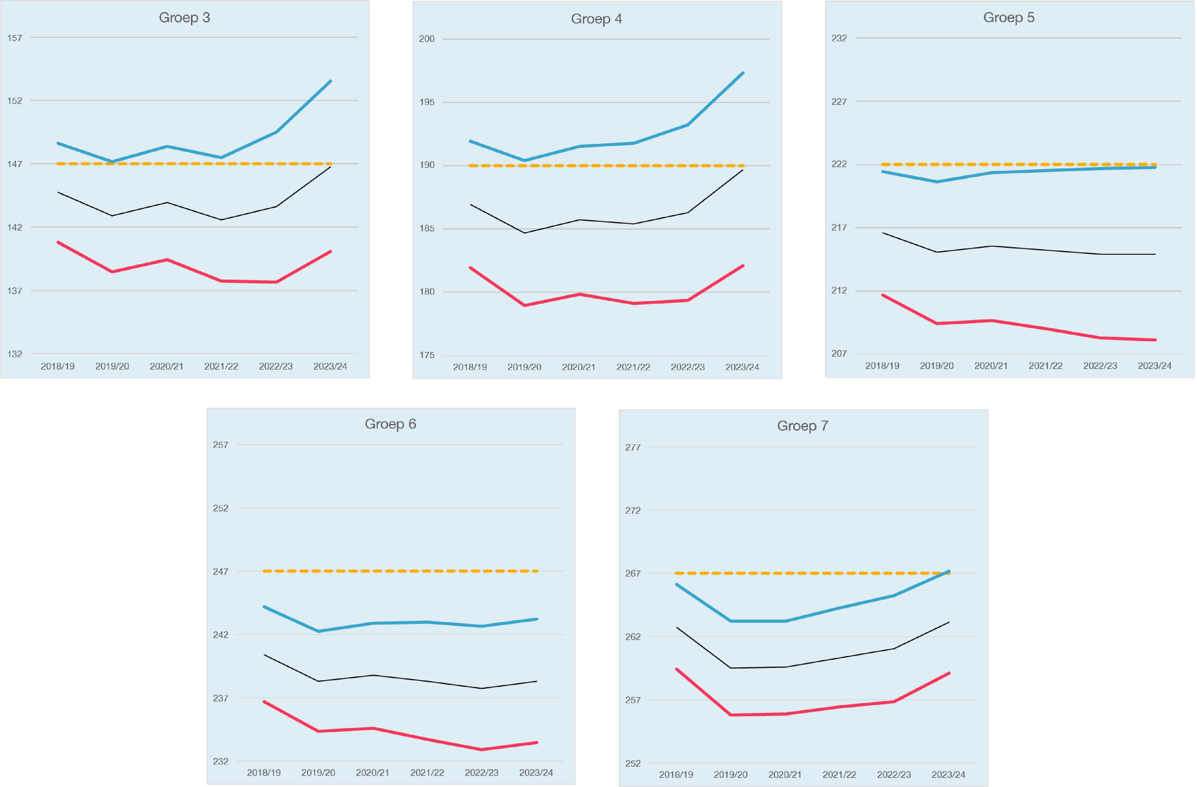 In de grafieken is per groep de rekenkloof in de afgelopen zes jaren in beeld gebracht. Zwart: totaalgemiddelde per groep. Blauw: gemiddelde vaardigheidsscore van jongens. Rood: gemiddelde vaardigheidsscore van meisjes. Oranje: indicatieve 1S-route (theoretische normlijn richting 1S eind basisschool). Let op: in groep 3, 4 en 5 is deze oranje stippellijn uitsluitend bedoeld ter oriëntatie; in de praktijk wordt 1S vanaf groep 6 expliciet gebruikt. De normlijn is in elke grafiek op dezelfde relatieve positie geplaatst om patronen tussen groepen visueel te kunnen vergelijken.