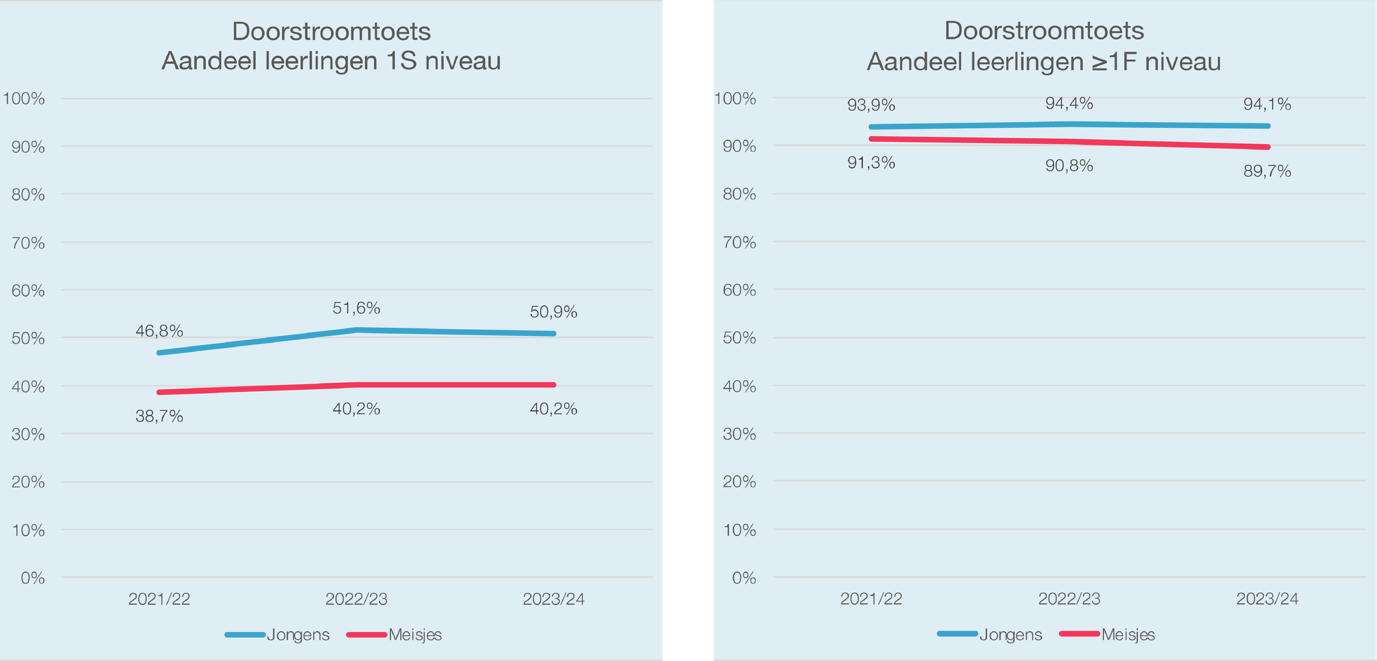 De NCO-data bestaan zoals gezegd uit gegevens over zes schooljaren (2018/19 - 2023/24). Met beschikbare gegevens van de doorstroomtoets in groep 8 uit drie van deze jaren (2021/22 - 2023/24). kan een vergelijking worden gemaakt met de NCO-data. In Figuur 2 is te zien dat binnen de referentieniveaus 1S en ≥ 1F eenzelfde verschil tussen jongens en meisjes bestaat: jongens scoren gemiddeld hoger.